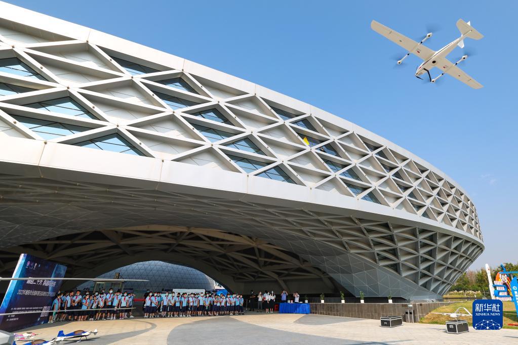 9月16日,在湖北省襄阳市科技馆,工作人员为学生演示无人机飞行技巧。新华社发(杨东摄)