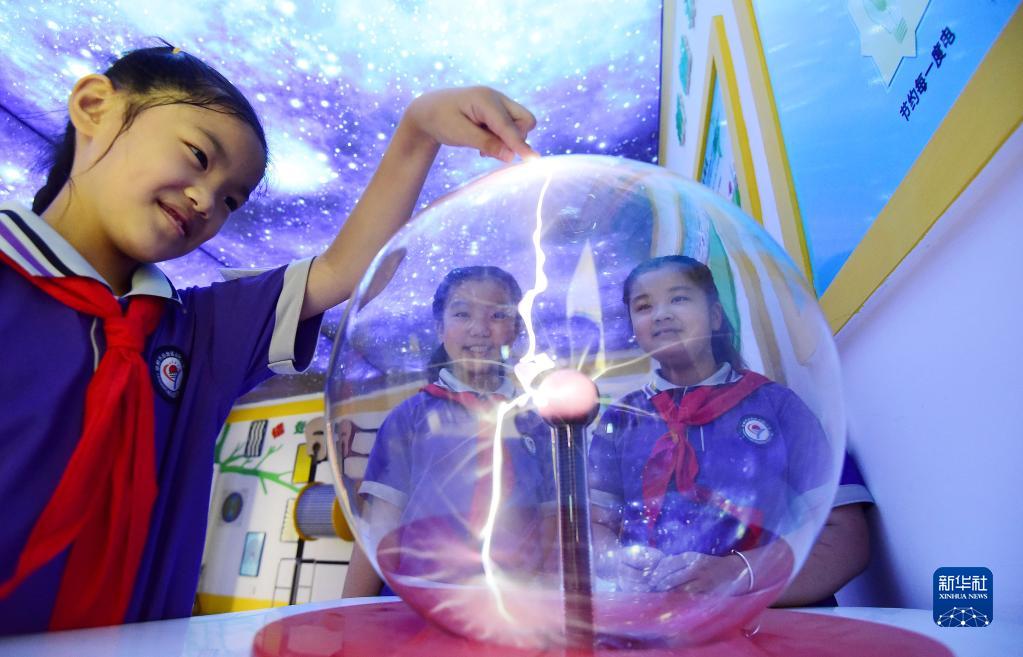 9月16日,河北省邯郸市丛台区丛阳小学的学生在校园科技馆体验“辉光球”。新华社发(郝群英摄)