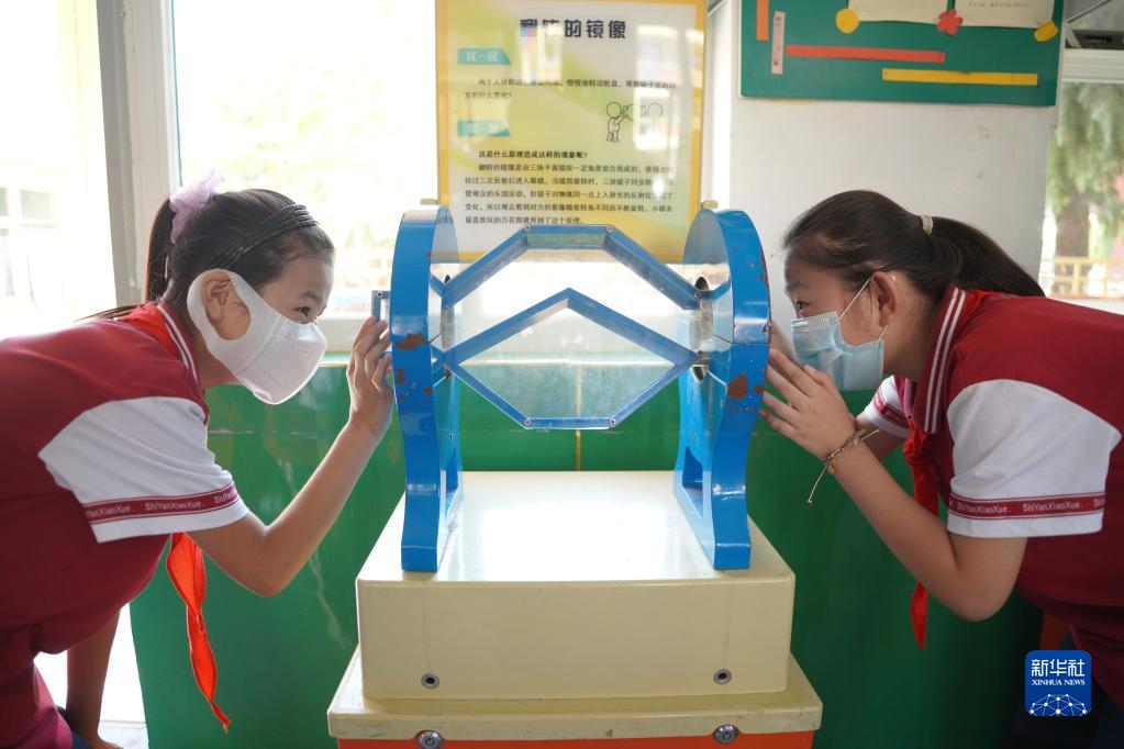 9月16日,河北省邢台市内丘县实验小学学生在科技大篷车巡展活动中体验“翻转的镜像”。新华社发(刘继东摄)