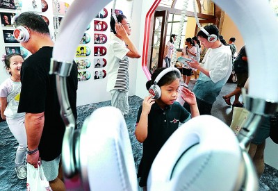 读者在上海书展现场戴上耳机感受“听书”。新华社发