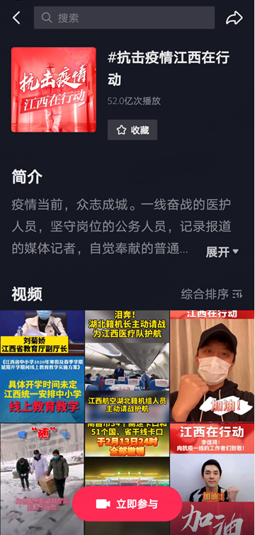2020年疫情防控期间,江西省委网信办组织中央和省内网站刊发相关报道4.2万篇,推出H5、短视频、MV等新媒体产品4000余件。联合抖音平台开展的“抗击疫情江西在行动”专题宣传,共组织400余个政务和新媒体账号,带动全国29个省(市)网民及自媒体账号参与,发布视频1.1万余条,其中网民及自媒体账号发布6900余条视频,内容包括权威发布、科普倡议、正能量故事、复工复产等各个方面,播放总量达52亿次,创全省历年单个正面话题阅读量新高,单条播放量过亿视频3条,过千万视频45条。