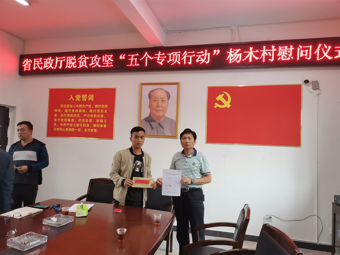 湖南省移动互联网协会、湖南省环境保护产业协会、湖南省高新企业协会、湖南省药品流通行业协会组成小分队共同在杨木村对白内障患者、贫困大学生等捐赠款项1.12万元,还捐赠了食用油、大米、农具等物资,确保履行湖南省民政厅组织开展的五个专项行动。