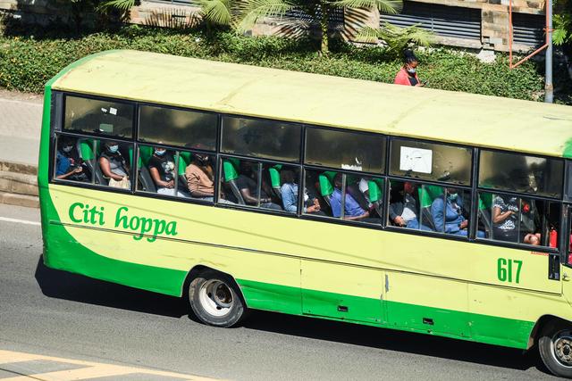 6月4日,在肯尼亚首都内罗毕,乘客佩戴口罩乘坐公交车。新华社记者 李琰 摄