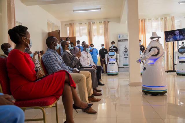 5月19日,在卢旺达首都基加利,人们观看一台智能移动机器人做自我介绍。新华社发(西里尔·恩德格亚 摄)