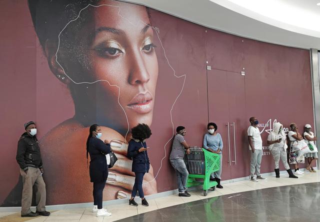 6月1日,在南非约翰内斯堡,佩戴口罩的人们在商场内排队等待购物。新华社记者陈诚 摄