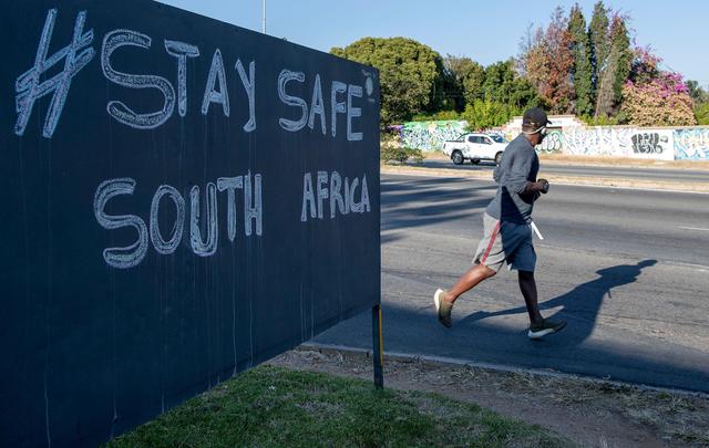 5月22日,在南非约翰内斯堡,一名晨跑的人经过一个为南非加油的路牌。新华社记者 陈诚 摄