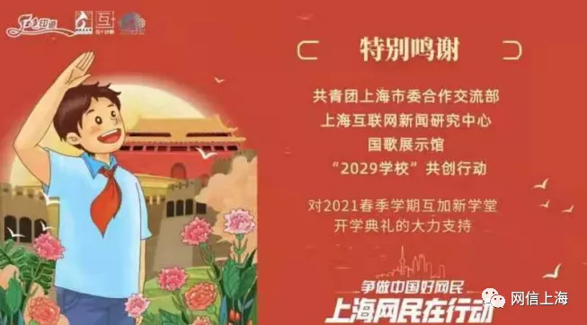 为积极响应党中央关于巩固拓展脱贫攻坚成果的号召,进一步引导上海与西部地区青少年厚植爱党爱国情怀、树立远大理想,2021年3月1日上午,全国各地中小学春季开学第一天,上海团市委合作交流部、市委网信办网研中心、国歌展示馆、沪江“互加计划”等单位共同发起的“我站立的地方是中国——点燃乡村振兴新希望”——全国村小2021新学期开学典礼暨“红色印迹”主题教育活动在国歌展示馆顺利举行,“纪念建党100周年系列网络课程”正式发布,并成为上海市争做中国好网民工程系列活动。