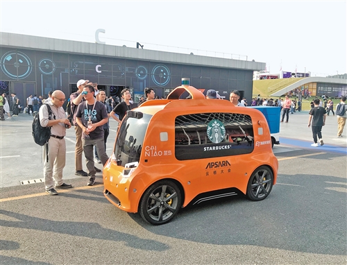 在本届阿里巴巴“云栖大会”会场外,一辆会避让行人的流动无人售货车引起了观众好奇。 记者 陈静摄