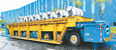 中国宝武宝钢股份宝山基地利用工业大数据等实现了无人驾驶重载框架车在钢铁冶金行业工业化运行。图为正在运输中的无人驾驶重载框架车。施琮 摄(人民图片)