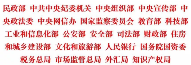 各省、自治区、直辖市民政厅(局)、纪委机关、党委组织部、党委宣传部、党委政法委、党委网信办、监察委员会、教育厅(教委)、科技厅(委、局)、工业和信息化主管部门、通信管理局、公安厅(局)、国家安全厅(局)、司法厅(局)、财政厅(局)、住房和城乡建设厅(委、管委)、文化和旅游厅(局);中国人民银行上海总部,各分行、营业管理部,各省会(首府)城市中心支行,各副省级城市中心支行;国资委、税务局、市场监管局(厅、委)、外汇管理部门(含计划单列市分局)、知识产权局: