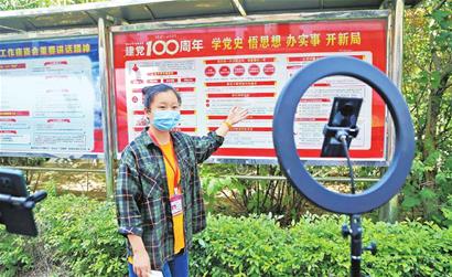 近日,新疆乌鲁木齐沙依巴克区红庙子片区福地社区工作人员王舒雅正通过视频直播的方式向居民宣讲党史知识。记者 蒋晓 摄